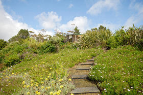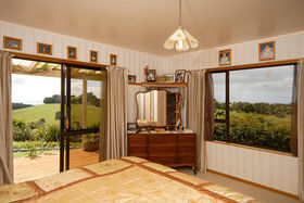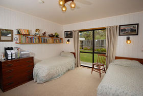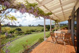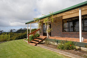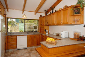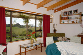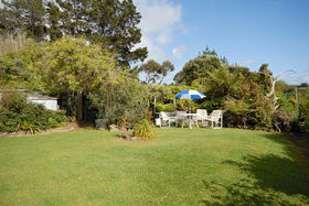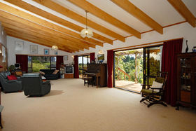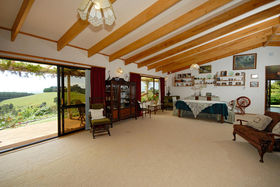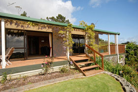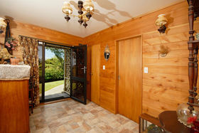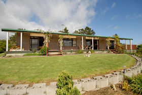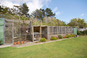 This large private sunny home with full length verandahs is surrounded by native bush and extensive gardens and also boasts bird avaries and potting sheds for those with green fingers and wings.