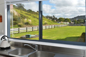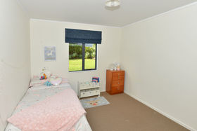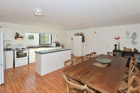 The open plan layout accesses a covered alfresco area leading out to warm and sunny north facing decks overlooking the huge flat expanse of lawn to a small patch of bush on the border. Plenty of parking for cars, boats, campervans and more space for tents and games.